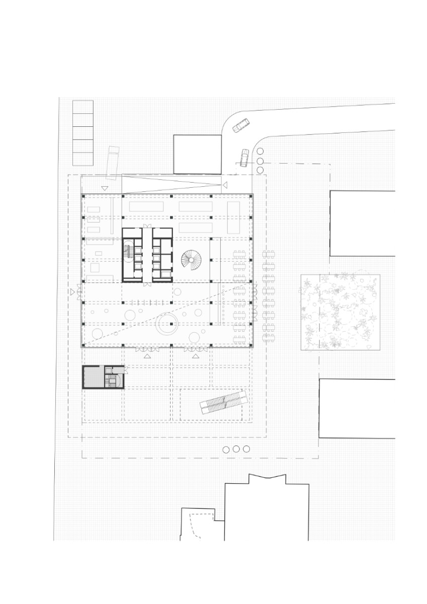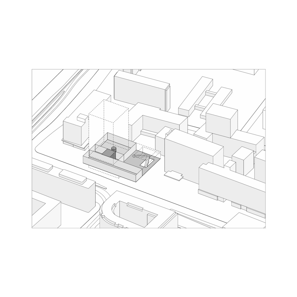 Our design reinterprets the industrial identity of the site by deconstructing the building into archetypal elements: the warehouse, the shed, the reticular structures and the acoustic bodies of the rehearsal rooms. Through collage we synthesized a recognizable identity. The urban park incorporates multiple conceptual layers: a water-sensitive design for flood-prone areas, elevated open spaces for temporary activities and a raised platform for events. A path connects the park with the building interior allowing visitors to admire the work behind the scenes.