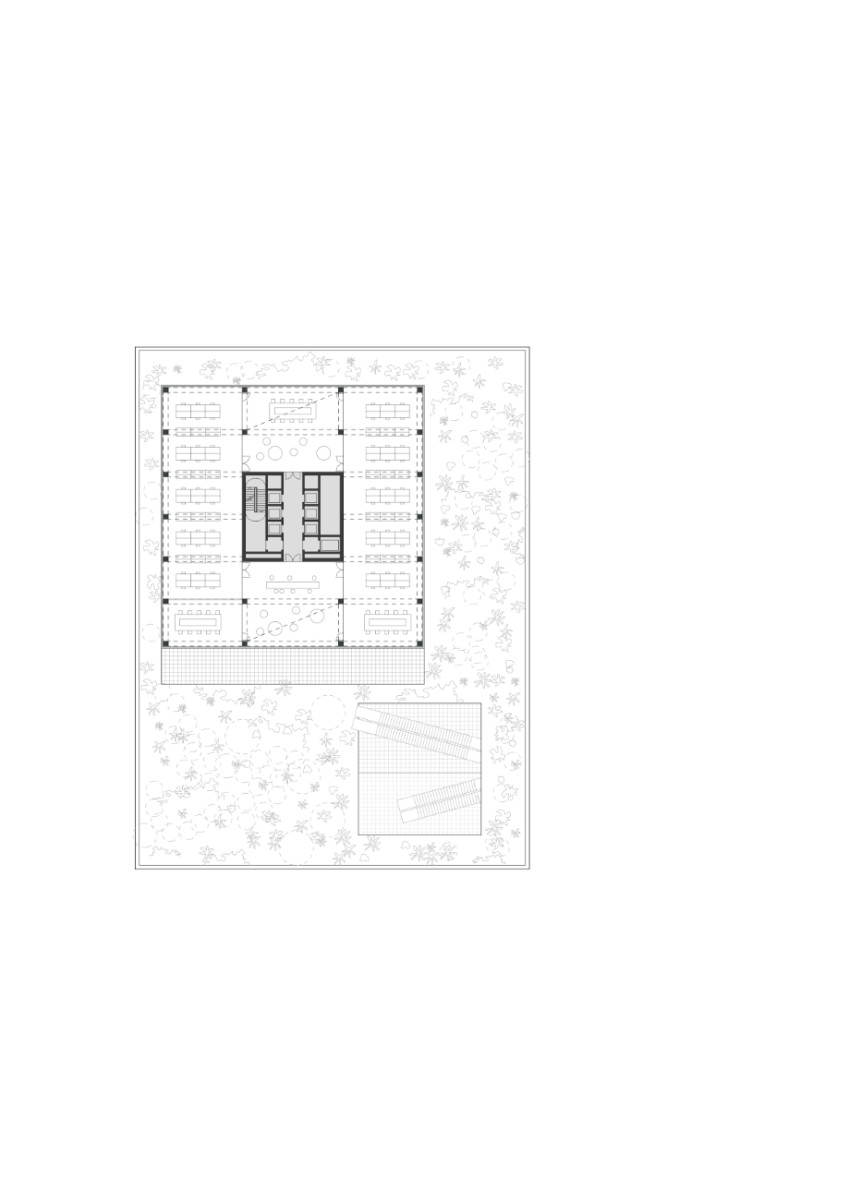 The new school building, with an hybrid wood-concrete structure, is built on two axialities: the two entrances from both the north and south side allow the permeability of the ground floor to the surrounding public spaces, while all floor are connected through a longitudinal axes to the garden, cut out in the woods and edged by the trees -a landscape for learning. A deciduous tree, in central position, creates a direct relationship between the interiors and the changing of seasons outside.