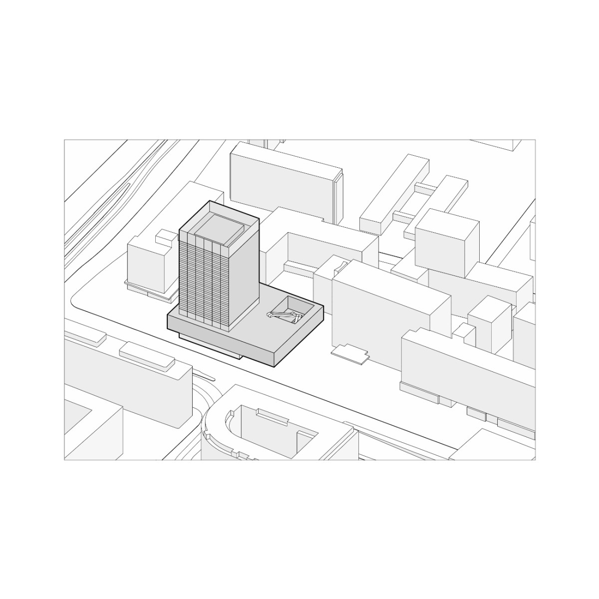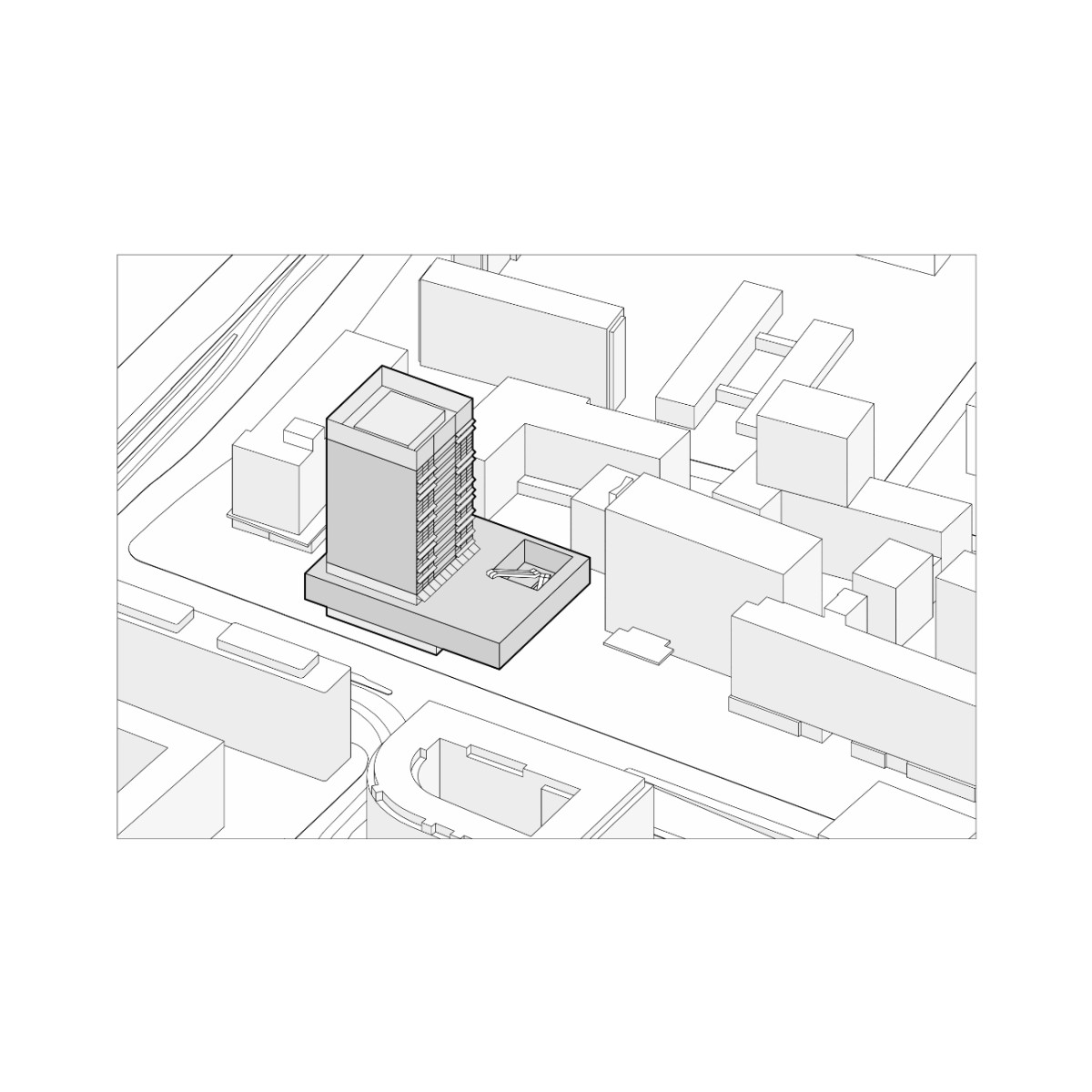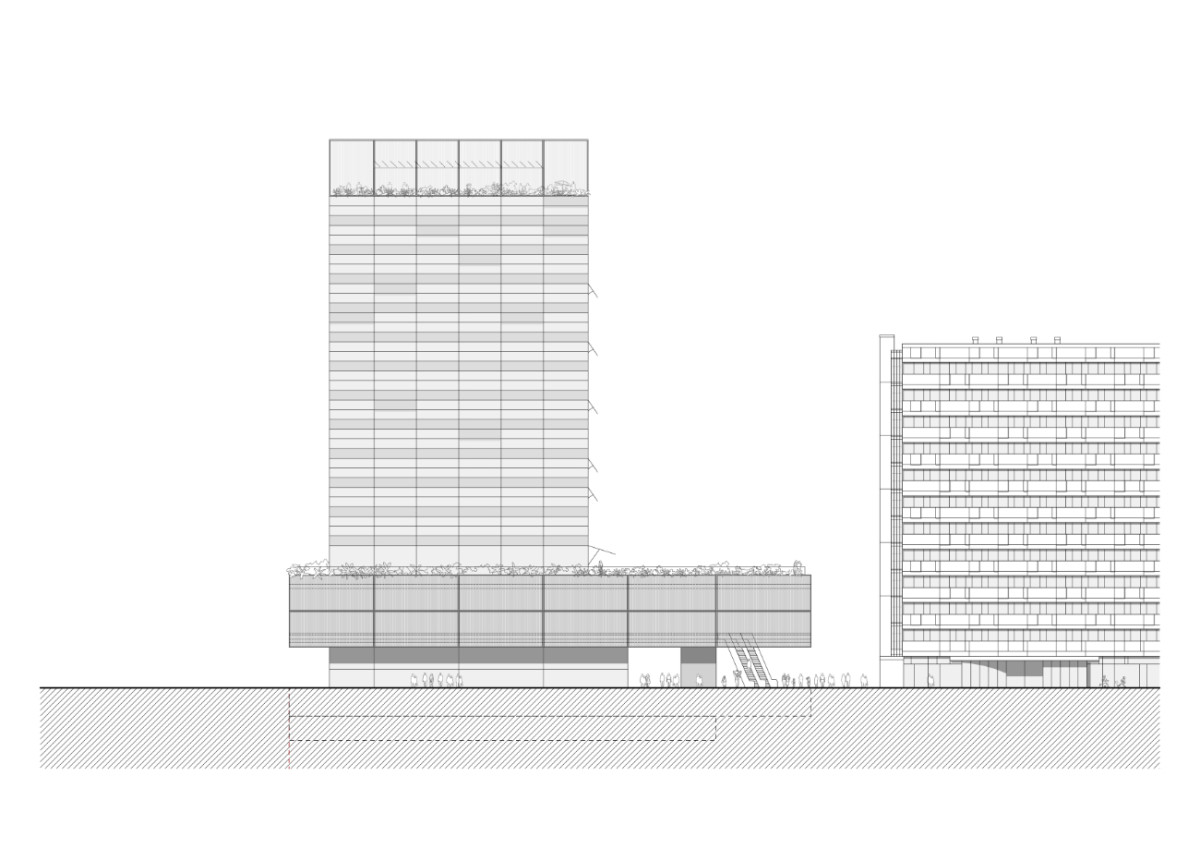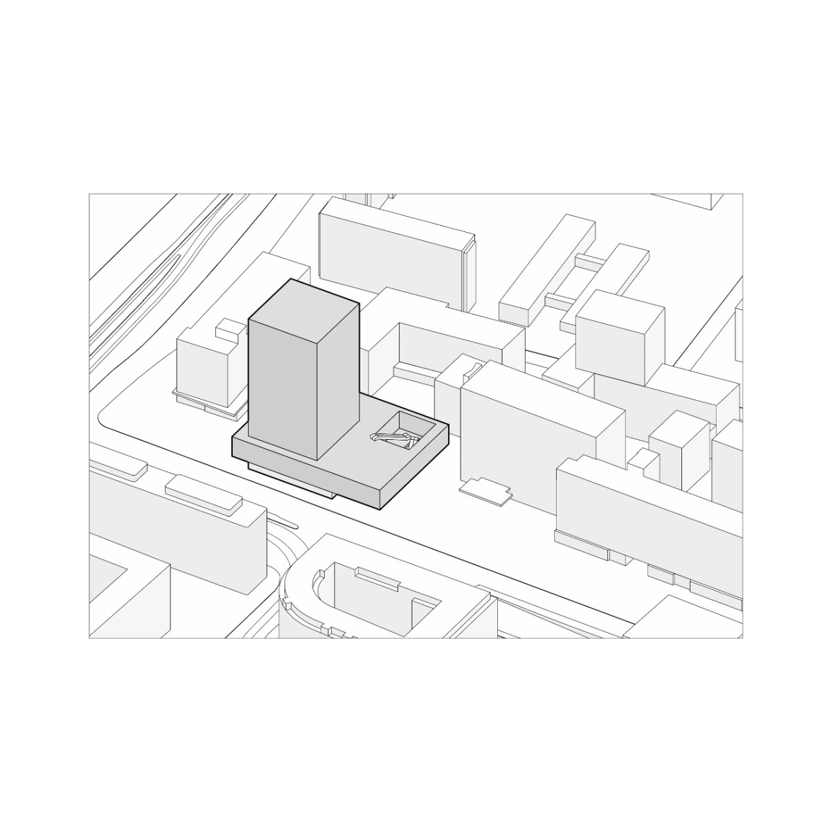 The building reacts to its context by negotiating between horizontality and verticality, in a dialog between openness and monumentality.