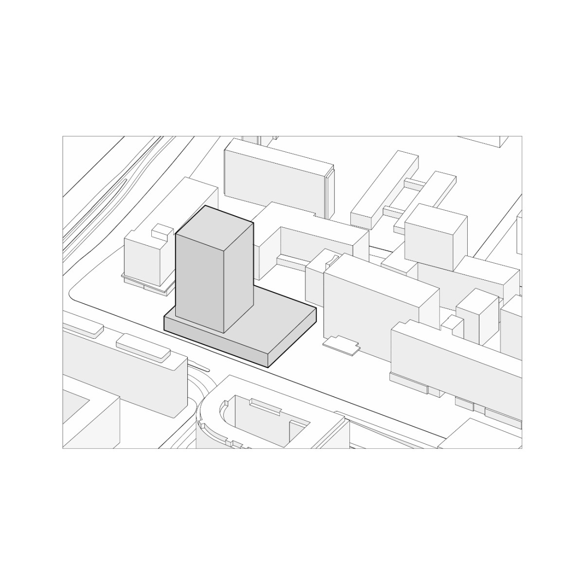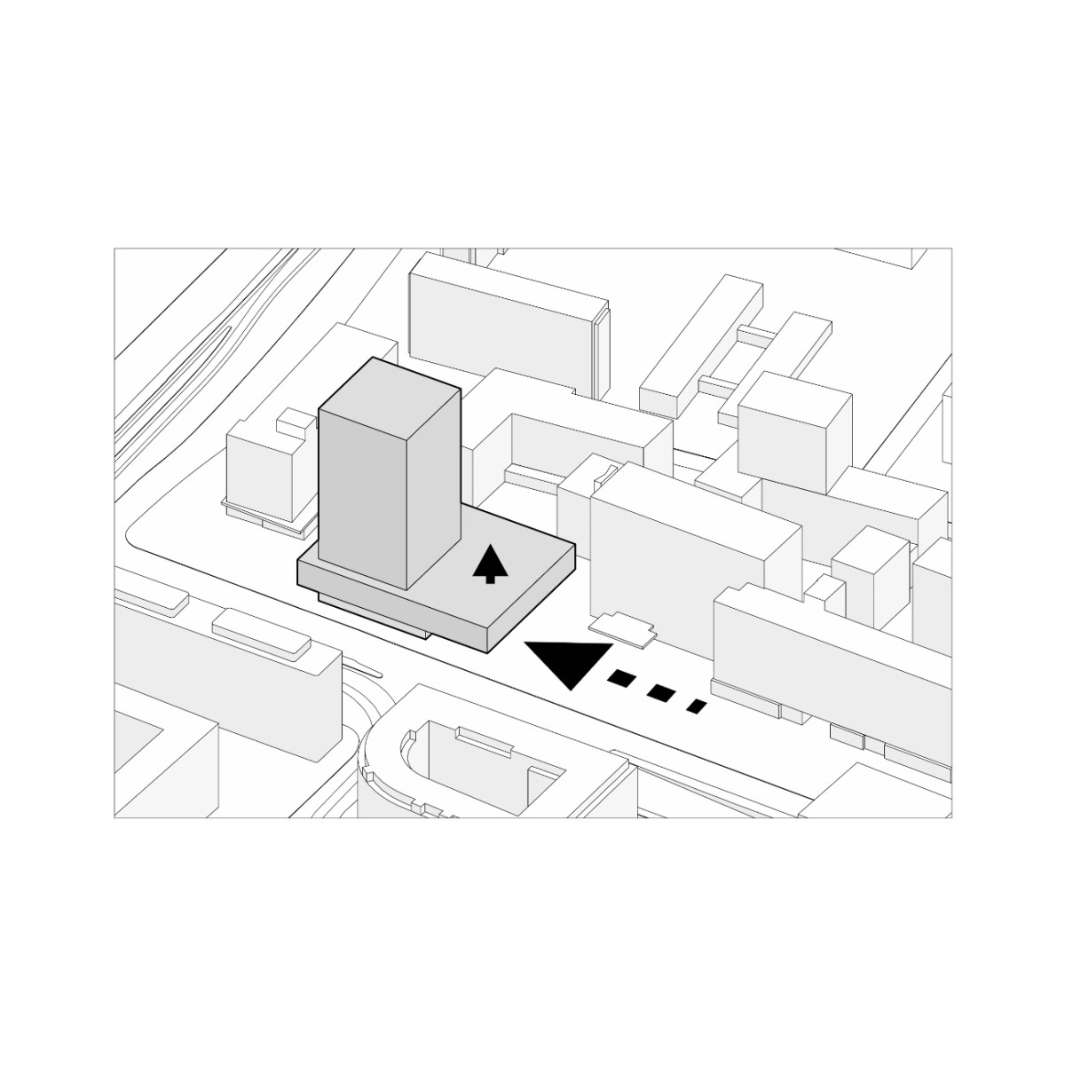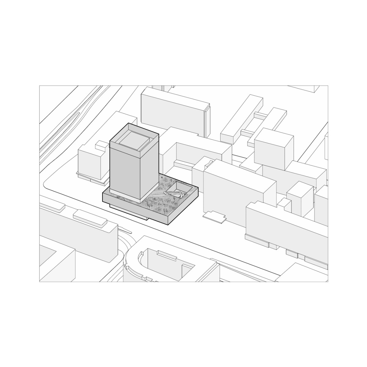 The building reacts to its context by negotiating between horizontality and verticality, in a dialog between openness and monumentality.